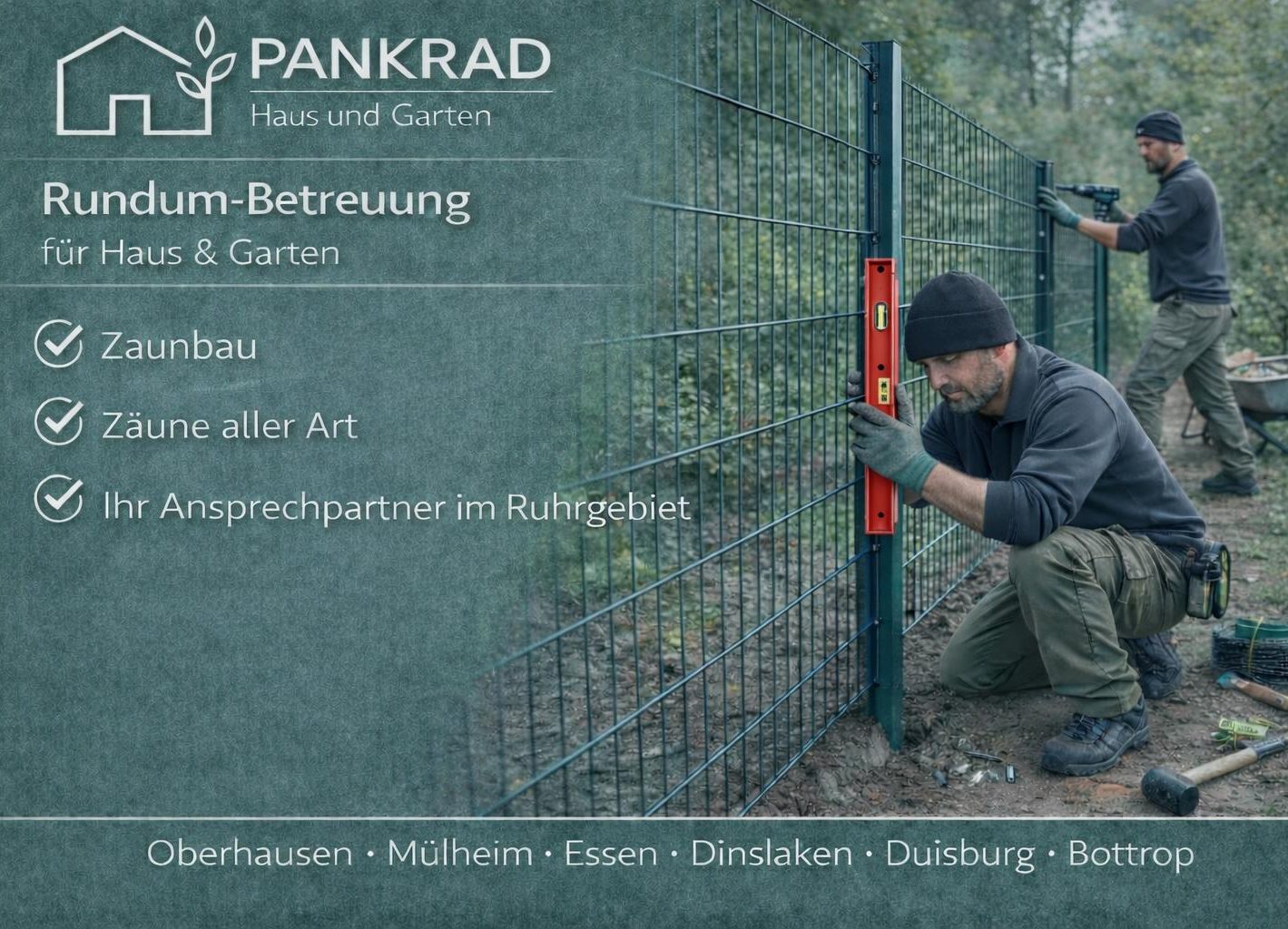 PANKRAD steht im gesamten Ruhrgebiet für präzise Umsetzung, hochwertige Materialien und verlässliche Projektabwicklung. Mit klar kalkulierbaren Leistungen erhalten Kunden Zaunsysteme, die Schutz bieten, den Immobilienwert steigern und optisch überzeugen – dauerhaft und wetterunabhängig.