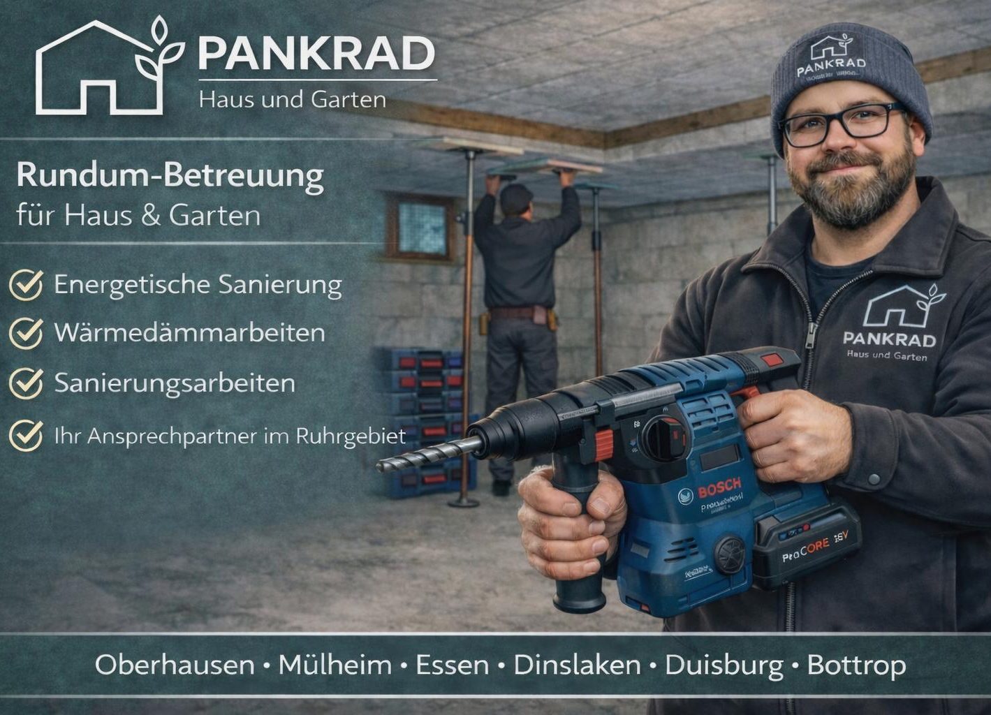 Ihr Zuhause verdient zuverlässige Hände – und genau dafür steht Pankrad in Oberhausen. Wir kümmern uns um alles, was Haus und Wohnung im Alltag brauchen: von Pflege und Reparaturen über Modernisierung bis hin zu effizienten Wärmedämmarbeiten, die Ihren Wohnkomfort spürbar erhöhen und Energiekosten senken.